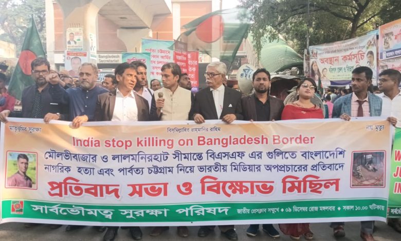 প্রেস বিজ্ঞপ্তি: সার্বভৌমত্ব সুরক্ষা পরিষদের উদ্যোগে ৯ ডিসেম্বর ২০২৫ মঙ্গলবার সকাল ১০:৩০ মিনিটে জাতীয় প্রেসক্লাব সম্মুখে মৌলভীবাজার ও লালমনিরহাট সীমান্তে বাংলাদেশি নাগরিক হত্যা এবং পার্বত্য চট্টগ্রাম নিয়ে ভারতীয় মিডিয়ার ষড়যন্ত্রের প্রতিবাদে প্রতিবাদ সভা ও বিক্ষোভ মিছিল অনুষ্ঠিত হয়।