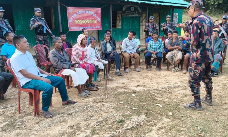 বাঘাইছড়ি প্রতিনিধি: আসন্ন জাতীয় সংসদ নির্বাচন ঘিরে সীমান্তে অবৈধ অস্ত্র গোলাবারুদ ও মাদক চোরাচালান ঠেকাতে রাঙ্গামাটির বাঘাইছড়ি উপজেলার সাজেক ইউনিয়নের দূর্গম সীমান্তবর্তী গ্রাম নিউথাংনাক পাড়ায় স্থানীয় গ্রামবাসীদের সঙ্গে জনসচেতনতা মুলক সভা করছে ৫৪ বিজিবি বাঘাইহাট ব্যাটালিয়ন।