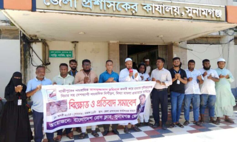 সুনামগঞ্জ প্রতিনিধি: গাজীপুরে প্রকাশ্য দিবালোকে গলা কেটে সাংবাদিক আসাদুজ্জামান তুহিন কে হত্যার প্রতিবাদে বাংলাদেশ প্রেস ক্লাব সুনামগঞ্জ জেলা শাখার উদ্যোগে মানববন্ধন ও বিক্ষোভ সমাবেশ অনুষ্ঠিত হয়েছে। রবিবার (১৮ আগস্ট) বেলা ১১ টায় সুনামগঞ্জ জেলা প্রশাসকের কার্যালয়ের সামনে এই মানবন্ধন ও বিক্ষোভ কর্মসূচি অনুষ্ঠিত হয়।