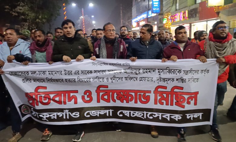 মোঃ ইসলাম, ঠাকুরগাঁও প্রতিনিধি: ঢাকা মহানগর উত্তর স্বেচ্ছাসেবক দলের সাবেক সাধারণ সম্পাদক আজিজুর রহমান মুসাব্বিরকে গুলি করে হত্যার প্রতিবাদে ঠাকুরগাঁওয়ে বিক্ষোভ মিছিল করেছে ঠাকুরগাঁও জেলা স্বেচ্ছাসেবক দল।