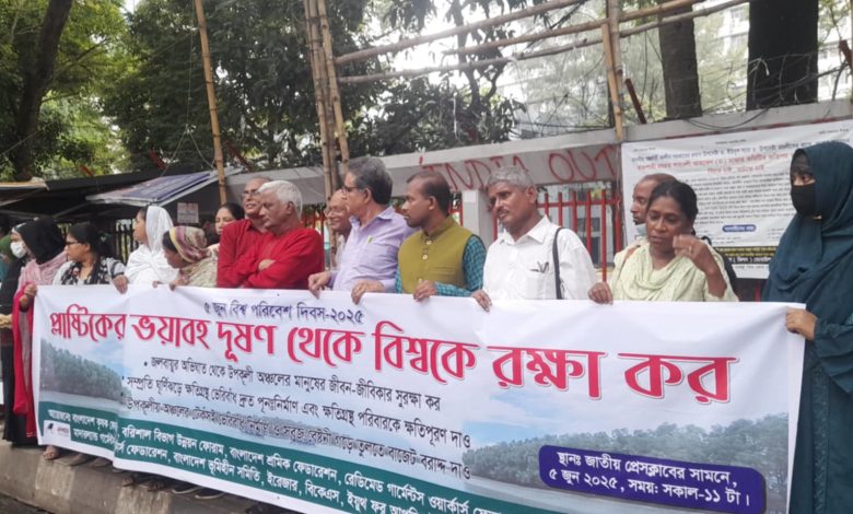 আজ ৫ জুন ২০২৫, ১২ সংগঠনের উদ্যোগে সকাল ১১টায় জাতীয় প্রেসক্লাবের সামনে বিশ্ব পরিবেশ দিবস উপলক্ষে এক মানববন্ধন ও সমাবেশ অনুষ্ঠিত হয়। বাংলাদেশ কৃষক ফেডারেশনের সভাপতি কমরেড বদরুল আলমের সভাপতিত্বে বক্তব্য রাখেন বরিশাল বিভাগ উন্নয়ন ফোরামের সভাপতি আবুল হোসেন ও যুগ্ম সাধারণ সম্পাদক খান মোঃ রুস্তম আলী, বাংলাদেশ কৃষক ফেডারেশনের সাধারণ সম্পাদক জায়েদ ইকবাল খান, বাংলাদেশ শ্রমিক ফেডারেশনের সাধারণ সম্পাদক এএম ফয়েজ হোসেন, বাংলাদেশ ভূমিহীন সমিতির সহ-সভাপতি ডা:শামসুল আলম, সম্মিলিত শ্রমিক ফেডারেশনের সাধারণ সম্পাদক নাহিদুল হাসান নয়ন, রেডিমেড গার্মেন্টস শ্রমিক ফেডারেশনের নেত্রী রুপালি বেগম, ইরেজার-নির্বাহী পরিচালক,আতিকুর রহমান, মো: নাসির মোল্লা নির্বাহী পরিচালক,ইয়ুথ ফর আপলিফট বাংলাদেশ,আশা মণি-আহবায়ক, ন্যাচার ক্যাম্পেইন প্রমূখ।