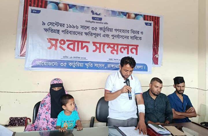মোঃ কামরুল ইসলাম, রাংগামাটি প্রতিনিধি: ১৪ সেপ্টেম্বর, সকাল ১১:০০ টায় রাঙ্গামাটির রাজবাড়ীর একটি রেস্টুরেন্টে আজ ৩৫ কাঠুরিয়া স্মৃতি সংসদের উদ্যোগে এক স্মৃতিচারণ ও সংবাদ সম্মেলন অনুষ্ঠিত হয়েছে। উপস্থিতরা ১৯৯৬ সালের ৯ সেপ্টেম্বর পাকুয়াখালীতে সংঘটিত ৩৫ বাঙালি কাঠুরিয়ার গণহত্যার নৃশংসতা স্মরণ করেন এবং বুকে থাকা ব্যথা, বিচারহীনতা ও রাষ্ট্রের উদাসীনতার বিরুদ্ধে কড়া নিন্দা জানান।